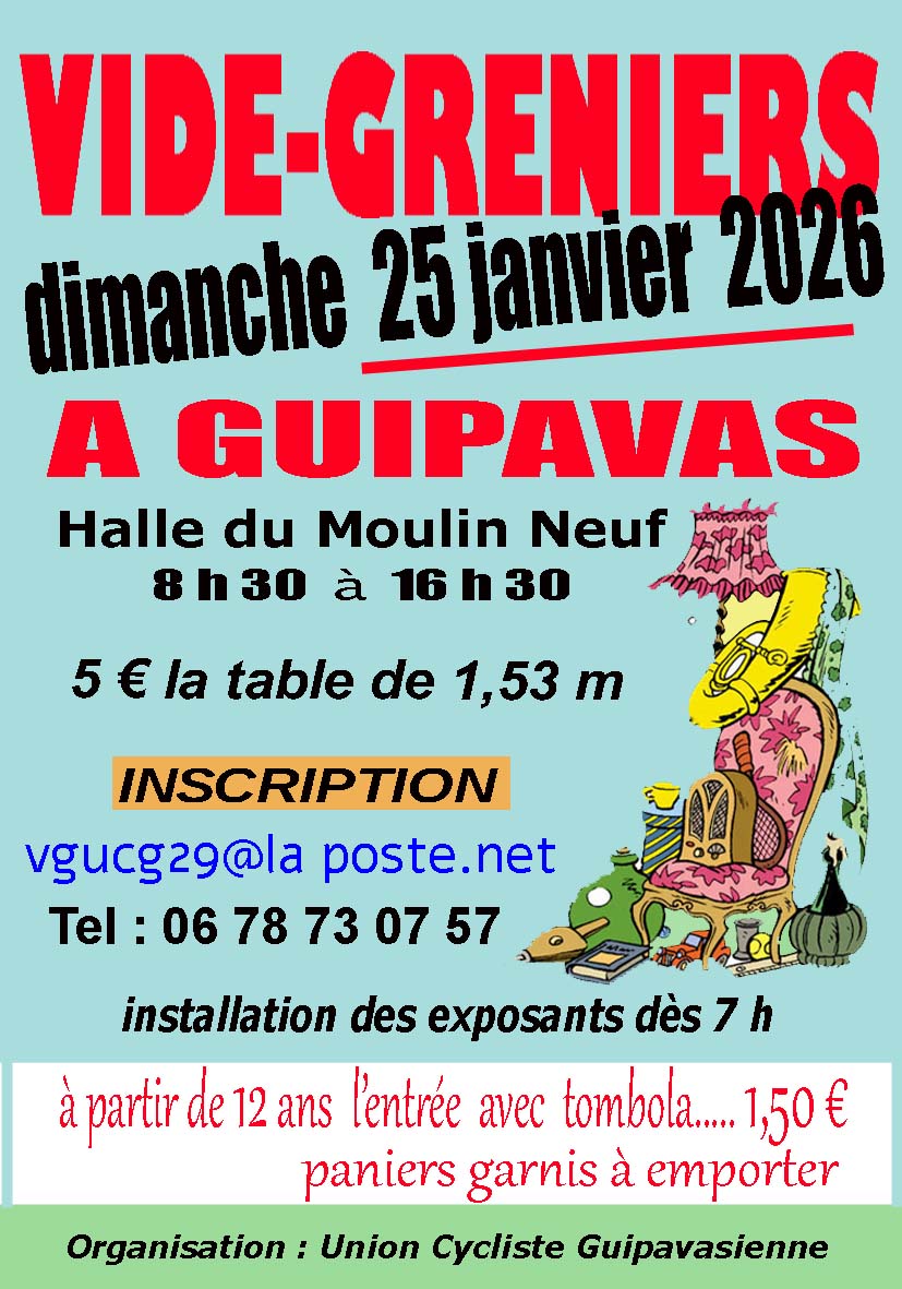 L’Union cycliste guipavasienne (UCG) propose son vide-greniers le dimanche 25 janvier 2026 de 8h30 à 16h30 au Moulin neuf.