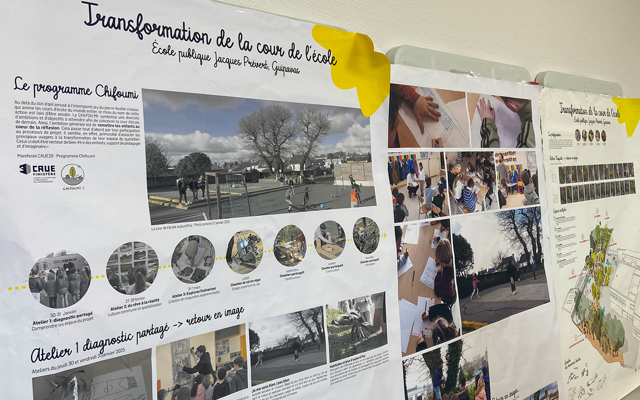 Le programme Chifoumi, porté par le conseil d’architecture, d’urbanisme et de l’environnement du Finistère (CAUE) avec la commune de Guipavas, a accompagné durant l’année 2025 la transformation de la cour de l’école élémentaire Jacques Prévert. Celle-ci s’est transformée pour accueillir des espaces aménagés et végétalisés. Ce chantier a été mené par Matthieu Véron et Léo Pouliquen de l’Atelier Bivouac (collectif de paysagistes dont l’antenne bretonne est basée à Plougastel-Daoulas).