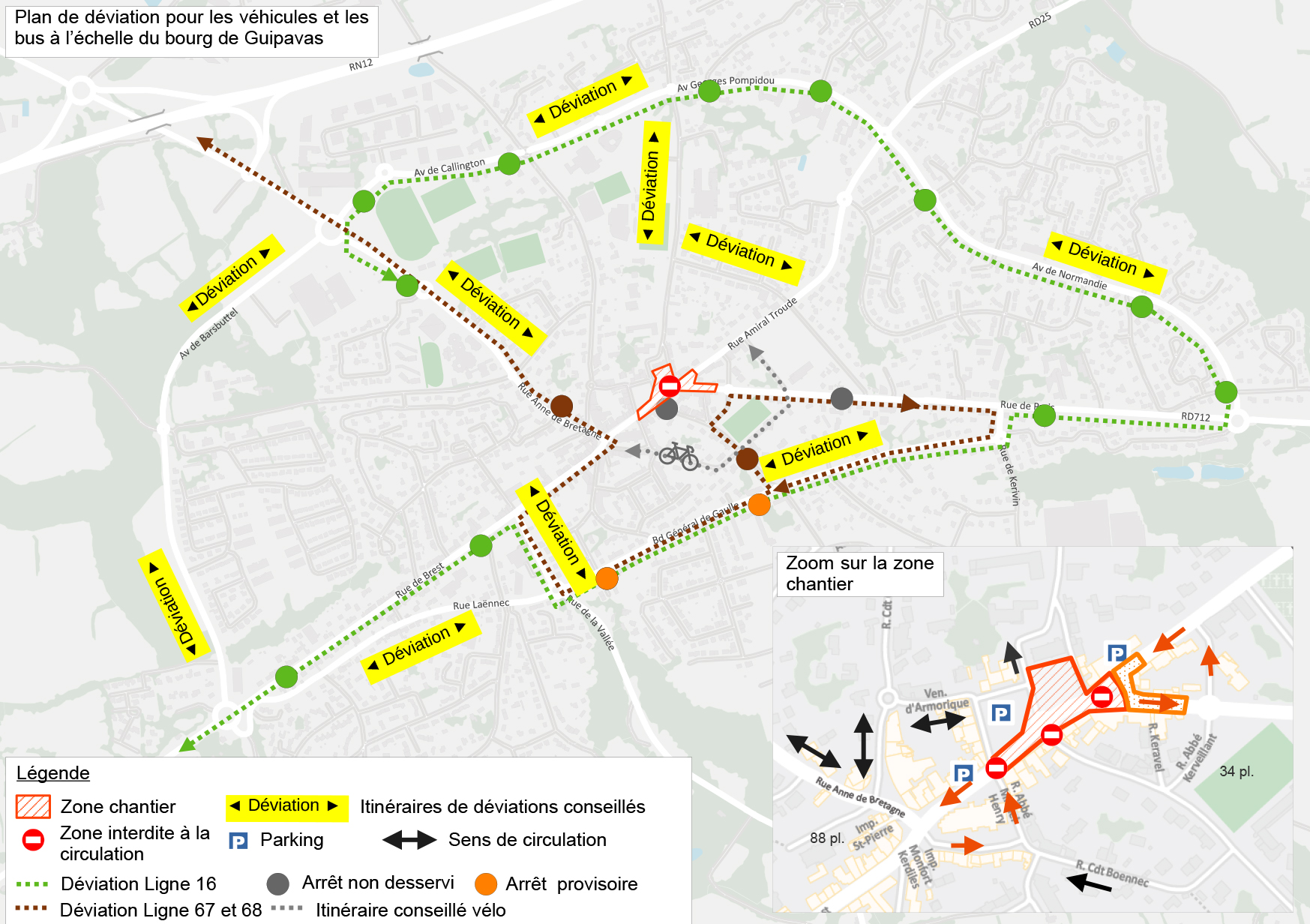 Itinéraire 1 : déviation par la rue de Brest, la rue de la Vallée, le boulevard Général de Gaulle, la rue commandant Charcot, la rue de Paris, le rond-point de Kergompez, l’avenue de Normandie, l’avenue Georges Pompidou, l’avenue Callington, le rond-point de l’Europe et la rue Anne de Bretagne.