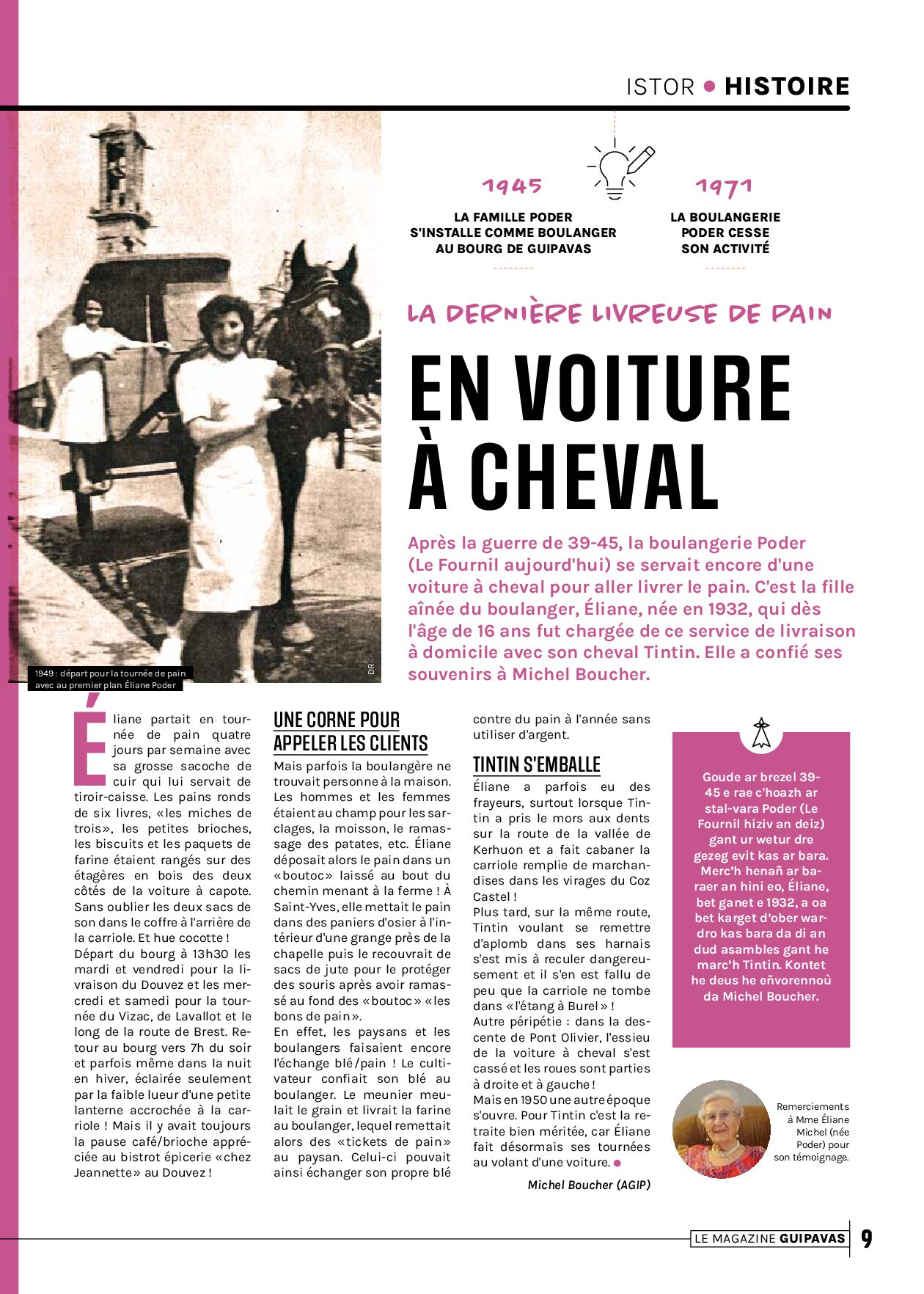 Après la guerre de 39-45, la boulangerie Poder (Le Fournil aujourd'hui) se servait encore d'une voiture à cheval pour aller livrer le pain. C'est la fille aînée du boulanger, Éliane, née en 1932, qui dès l'âge de 16 ans fut chargée de ce service de livraison à domicile avec son cheval Tintin. Elle a confié ses souvenirs à Michel Boucher.